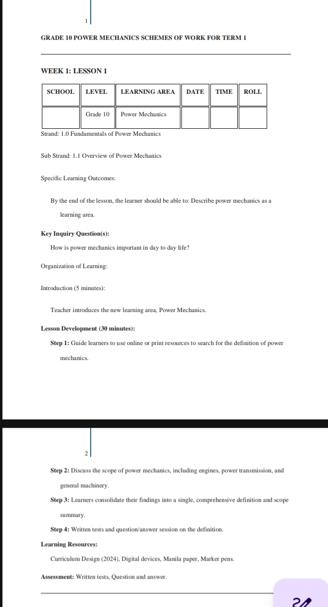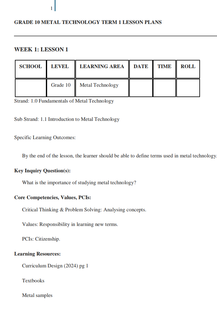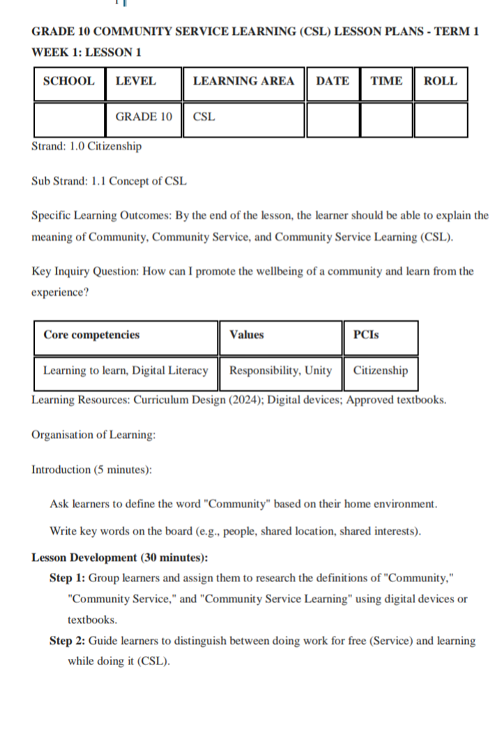 Best rationalized CBC /CBE Senior school Business studies Grade 10 lesson plan term 1