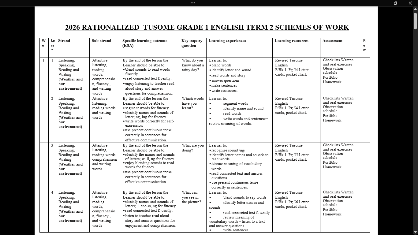 GRADE 1 TERM 2 ENGLISH SCHEMES OF WORK 2026