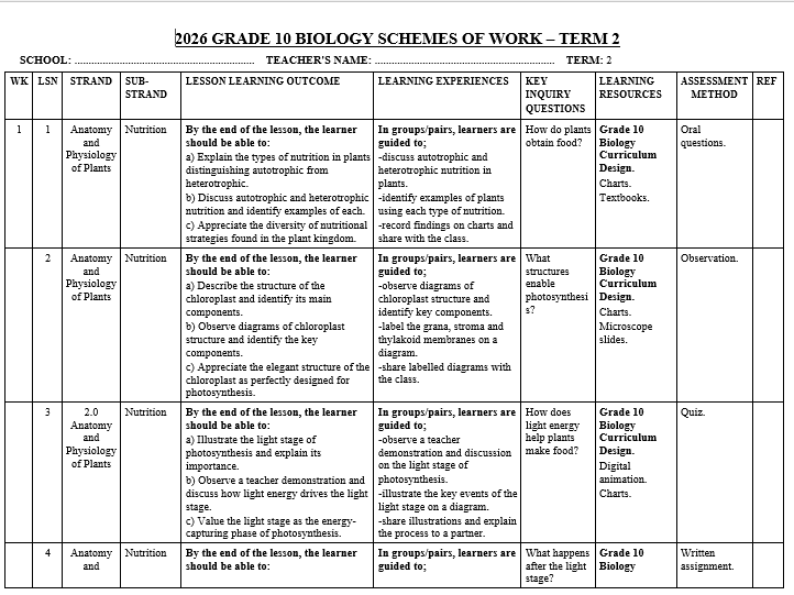 GRADE 10 TERM 2 BIOLOGY SCHEMES 2026