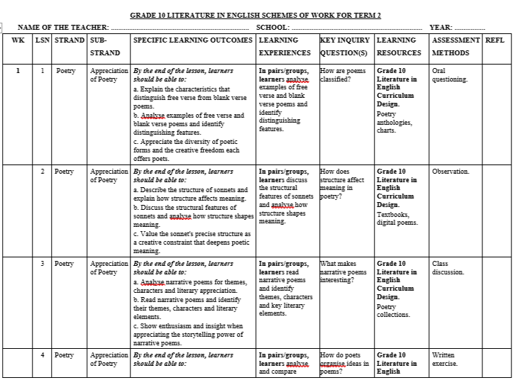 ENGLISH LITERATURE schemes of work term 2 grade 10 2026 editable word format