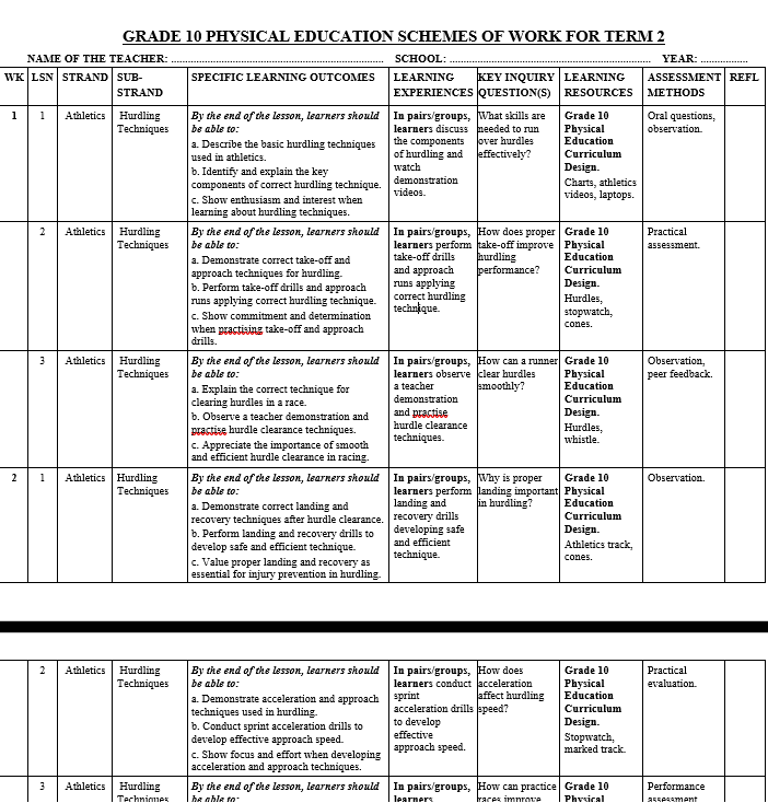 GRADE 10 TERM 2 PHYSICAL EDUCATION SCHEMES 2026