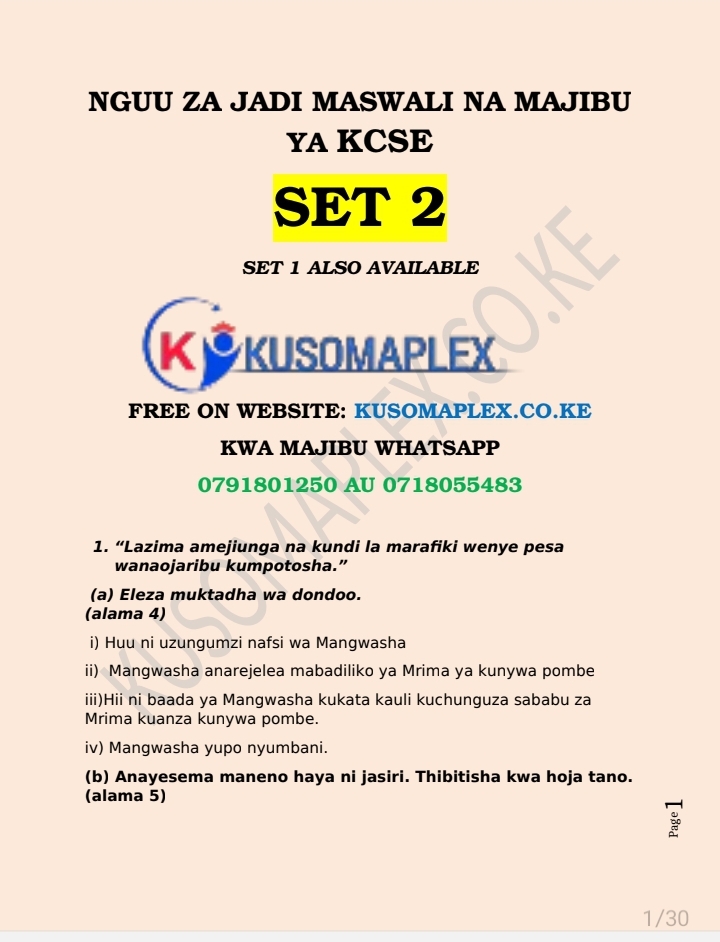 Set 2 KCSE questions and answers for nguu za jadi. Maswali na majibu ya dondoo. 30 pages. 12 Questions.